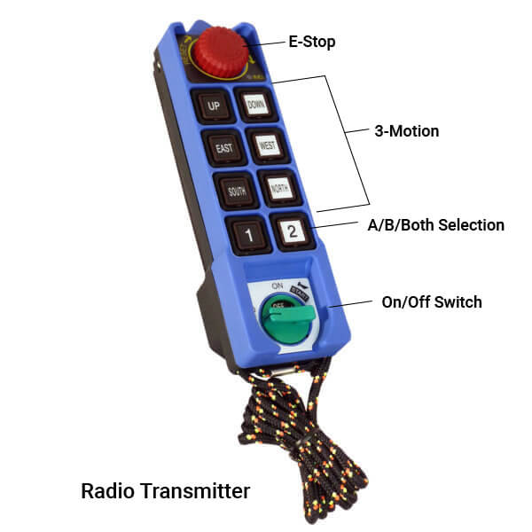 “Motion” is the term used to refer to how many different components a radio can control. A 1 motion radio is used to control a hoist. A 2 motion radio is used to control a hoist and trolley. A 3 motion radio is used to control a hoist, trolley, and a bridge. Radios with 4 or more motions are for more advanced applications where the operator wants control multiple hoists, trolleys, or bridges all at the same time.